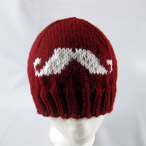 Il cappellino lavorato in tondo con un motivo stranded di Kathy Doherty ha un bel baffone a manubrio proprio sulla calotta. Il modello costa 3,99 dollari, metà degli utili sarà devoluta proprio a Movember. Si realizza con i ferri circolari partendo dal basso e per il baffone basta una piccola quantità (un avanzo) di un filato simile in un colore a contrasto.