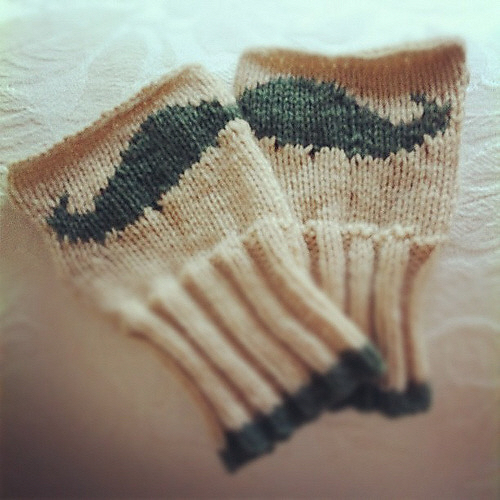 A Movember è freschino: se avete freddo alle mani ecco i mezzi guantini baffuti di Amanta Collins, perfetti se state imparando la tecnica dell’intarsio (oppure potete ricamarli a punto calza).