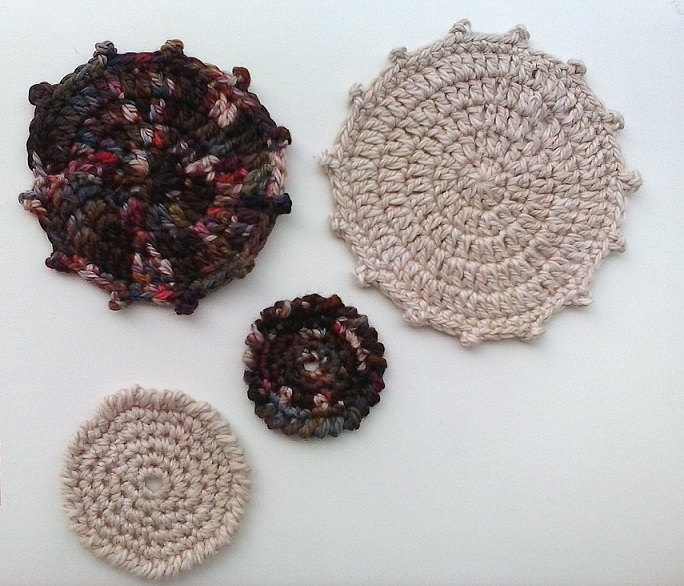 Il cotone stampato a mano è stato una bella sorpresa, dal momento che presenta delle screziature che, solitamente, non vanno d’accordo con la lavorazione all’uncinetto. Un colore che, sul filato, occupa poco più di un centimetro viene, potremmo dire divorato dai giri che il filo compie su se stesso durante l’esecuzione del punto. In questo modo, il risultato sarà un’accozzaglia frenetica di punti di colore. Invece il cotone Pima stampato a mano dà un buon risultato visivo, dovuto in parte sicuramente alla scelta nella combinazione dei colori. Come si può vedere, nel campione a maglia alta ha creato come dei raggi nel campione lavorato in tondo. Più affollata, ma non sgradevole, neppure la resa sulla maglia bassa.