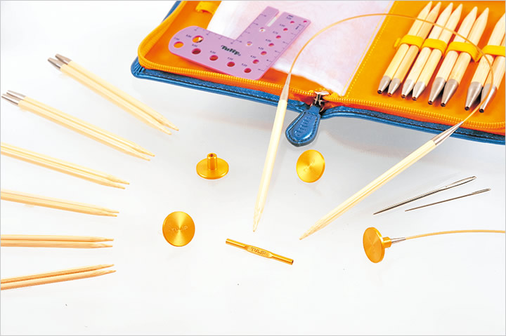 Il Giappone è la capitale dei ferri di qualità in bambù e questo set di Tulip non fa eccezione alla regola. Si tratta di ferri intercambiali in bambù con raccordi in metallo. Il kit comprende 11 coppie di punte, 3 cavi e una serie di accessori che comprendono 2 aghi da lana e un bel misuraferri con squadra per misurare i campioni e perfino un tagliafilo. Le punte sono di un bel bambù liscio e omogeneo fin sulla punta, scorrevole ma con quel tanto di attrito necessario a non far scappare il filo. Il cavo, in un morbido nylon ambrato, è privo di memoria: anche tenuto per parecchi giorni strettamente arrotolato si è immediatamente svolto senza conservare la forma in cui era stato costretto. I terminatori permettono al cavo di ruotare liberamente.