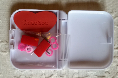 Il set ChiaoGoo mini è completato dal kit degli accessori, contenente due terminatori per chiudere il cavo mettendo il lavoro in sospeso, due spilli a T che fungono da chiavetta per assicurare il cavo alla punta, una presina in gomma rossa a forma di cuore, due raccordi che permettono di unire tra loro i cavi, e alcuni marcapunti ad anello. Tutti questi accessori sono contenuti in una comoda scatoletta bianca in plastica rigida. Gli accessori sono anche disponibili in kit separato e, ovviamente, come singoli ricambi.
