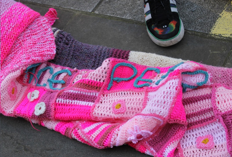 Abbiamo già più volte scritto che lo yarn graffiti, che ormai si è ridotto a decorativismo urbano, è venuto a noia ad almeno metà della redazione, ma in questo caso mi pare che invece abbia ripreso la sua verve proprio associando le arti manuali a un messaggio sociale e politico di tipo forte (come è tipico del craftivism, parola nata dall’unione dei termini craft e activism).