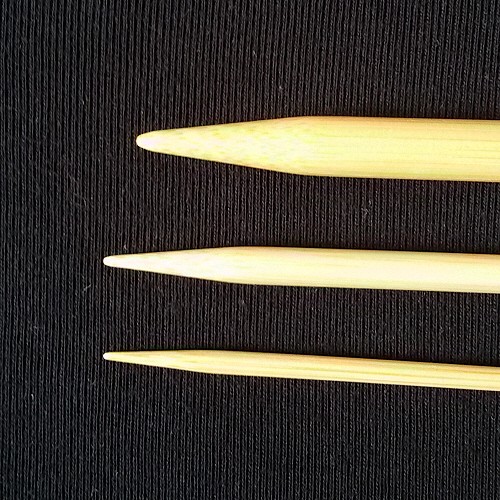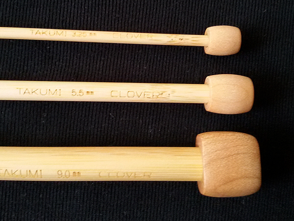 Clover ha reagito a questo sorpasso decidendo di tornare al tavolo di progettazione dei suoi aghi Takumi, che ora tornano in una versione completamente rinnovata. Noi abbiamo avuto modo di testare i soli aghi dritti, nelle lunghezze 40 e 33 cm. L’aspetto dei ferri è chiaro, non molto diverso dai vecchi Clover finché non si presta attenzione alla forma della punta, che immediatamente appare modellata molto meglio che nella prima serie, con un profilo conico piuttosto aguzzo nelle misure minori, più arrotondato per non spaccare il filo nelle misure più grandi. Gli aghi sono leggeri, lisci ma non scivolosi, privi di irregolarità, caldi. Per quanto il bambù sia materiale vivo, la lavorazione di questi aghi fa sì che risultino perfettamente rettilinei, anche se nelle misure superiori capita che siano relativamente notevoli i nodi del bambù (comunque perfettamente lisciati fino a restare irrilevabili al tatto). Il ferro è rifinito con un terminatore arrotondato, abbastanza grande da non permettere alle maglie di cadere (nemmeno per chi ha la mano molto morbida) ma non ingombrante o pesante, nei sui pressi il numero è inciso in maniera abbastanza leggibile nei calibri superiori, un po’ confusa per quanto riguarda i calibri più piccoli.