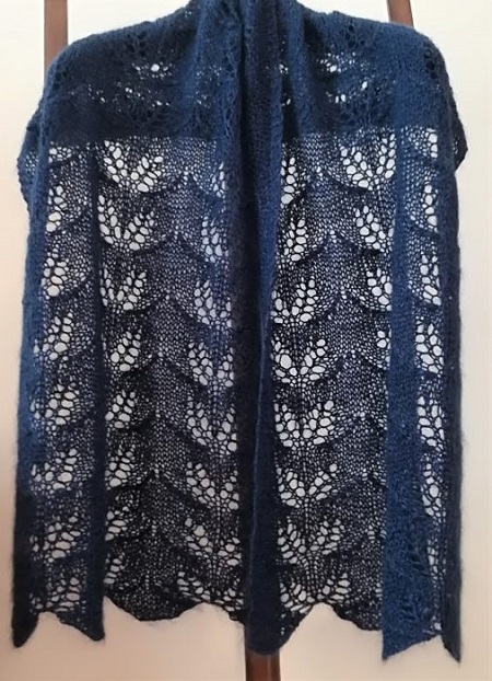 Per il prototipo che vedete in foto ho scelto di unire due filati, un puro Lino BC Garn e un bellissimo misto mohair-seta. Sono contentissima del risultato: la stola è giustamente “pesante”, ha un alone importante grazie al mohair, e una bella lucentezza. I due colori, il viola del lino e il blu del Silkid danno vita ad un tessuno leggermente screziato molto gradevole.