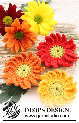 Scegliete un pattern di un oggetto piccolo, come i fiori Drops Design in foto, un accessorio, in modo da non portare con voi un kilo di filato per uno scialle da comitiva.