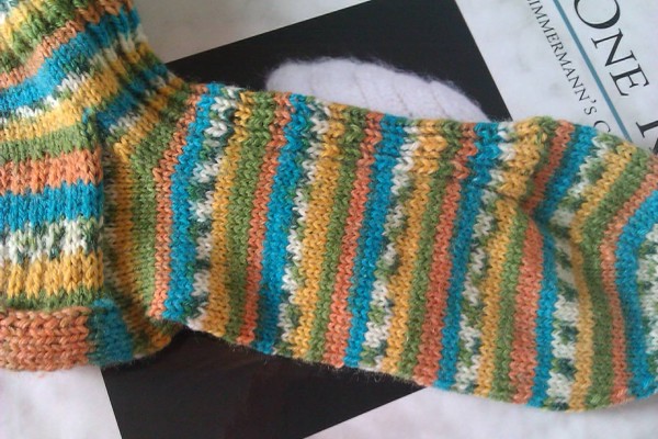 Per fortuna, l’elasticità del filato è ottima, anche se la variegatura self striping (“autorigante”, produce da sola le rigature) la rende utilizzabile solo per lavorazioni molto semplici (legaccio, rasata, coste), dato che trecce e traforati si perdono completamente. Anche il colore da subito, per quanto brillante e allegro, mi ha delusa: le rigature infatti sono molto sottili; in un calzino lavorato su 64-66 maglie infatti le ripetizioni riescono a creare 2-3 giri per colore, rendendo la calza visivamente piuttosto poco interessante. Questo effetto è poco vistoso sul campione, lavorato su un numero di maglie nettamente inferiore, ma diventa molto evidente nella calza finita ed è particolarmente fastidioso nella riga a finto fair-isle, troppo sottile per sviluppare correttamente la screziatura.