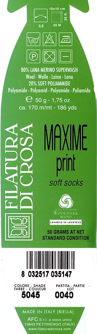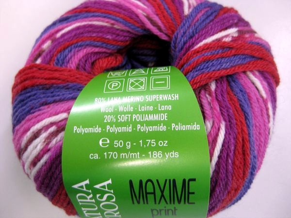 Un filato per calzini deve avere poche caratteristiche essenziali: deve essere resistente, non infeltrire, non fare pallini, avere dei bei colori. Ovvaimente, le prime tre caratteristiche possono essere giudicate solo sulla base dell’uso del calzino finito, l’ultima appare piuttosto vistosamente osservando il morbidissimo gomitolo di questa Maxime Print, che effettivamente è coloratissimo (forse pure troppo) e molto soffice, come afferma la fascetta stessa che specifica che questa produce “soft socks”.