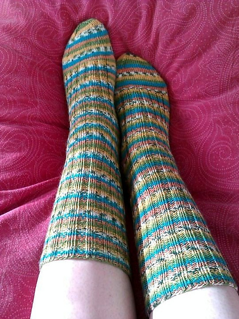 Calze per principianti con un facile motivo a coste. Per questi calzini ho usato il tallone olandese e la punta francese, due metodi che evitano ogni complicazione possible. Il filato consigliato può essere sostituito con qualsiasi lana specifica per calze in peso light fingering. usando un filato autorigante è possibile usare le ricorrenze della striatura per facilitare il calcolo della lunghezza della calza. Se desideri lavorare due calze identiche da un filato stampato come questo, assicurati di iniziare il lavoro dallo stesso punto della sequenza di colore, il modo più semplice per farlo è iniziare ad avviare le maglie alla giunzione tra due colori (gli stessi per entrambi i calzini). Il filato che ho usato per queste calze, tuttavia, era di due bagni diversi e ogni gomitolo aveva sequenze di colore leggermente diverse, quindi mi è stato impossibile lavorare le calze identiche al 100%. Se desideri delle calze più lunnghe o più corte, lavora qualche giro in più o in meno nella parte a maglia rasata della punta, prima delle diminuzioni.