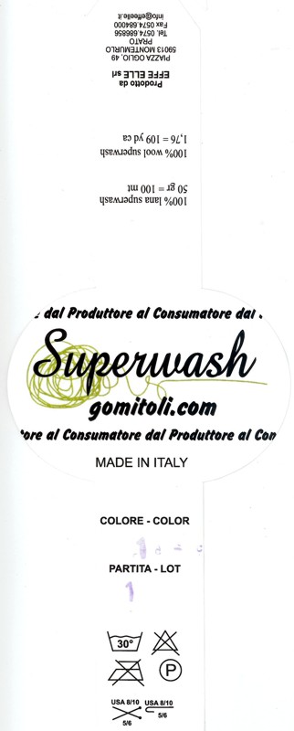 Superwash di Gomitoli.com è decisamente un filato con gli effetti speciali. Il filo ha una struttura particolarissima, uno stoppino di lana purissima trattata antinfeltrente avvolto da un sottile filo in materiale altro che gli dà un’interessante struttura a spirale che imita i filati bouclé senza esserlo. La mano non appare eccezionalmente calda ma è morbida, molto liscia e giustamente gonfia.