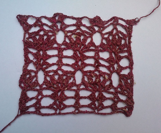 La seta si lavora piacevolmente all’uncinetto, senza aprirsi. Completamente priva di elasticità, come è naturale, non la consiglierei affatto per coste a maglia o all’uncinetto, la forza di questo filato sta nel modo in cui il lavoro si drappeggia, specialmente il pizzo, e nella sua lucentezza. I punti restano piuttosto definiti. Non perde il colore durante il lavaggio e non cambia di consistenza o dimensioni una volta asciutta. La messa in forma, essenziale per il pizzo, resiste a lungo.