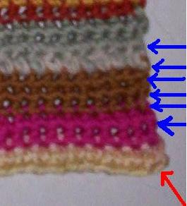 Sui lati, dovrete inserire l’uncinetto in quello che è il margine verticale della maglia bassa (nell’immagine, dove sono le frecce azzurre, vedete un buchino, là va lavorata la maglia bassa).