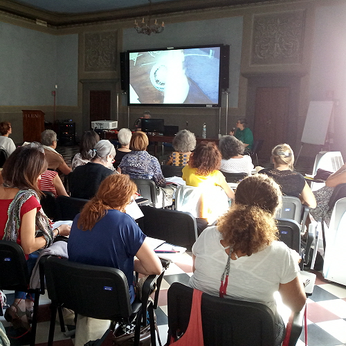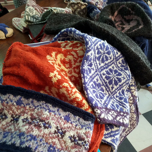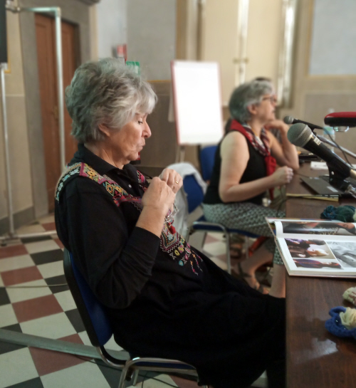 Dopo una breve conferenza tenutasi venerdì sera, i giorni di sabato e domenica sono stati invece dedicati a due lunghe conferenze. La prima sulla costruzione degli sproni bottom-up con il metodo EPS per il calcolo della taglia. La seconda sulle lavorazioni a due colori di tipo stranded, e in particolare la lavorazione Fair Isle e armena. Nonostante il grande numero di persone presenti all’evento, le due conferenze sono state rese chiare e facili da seguire dalla presenza di un grande schermo su cui era facilmente possibile seguire le tecniche illustrate da Meg Swansen.