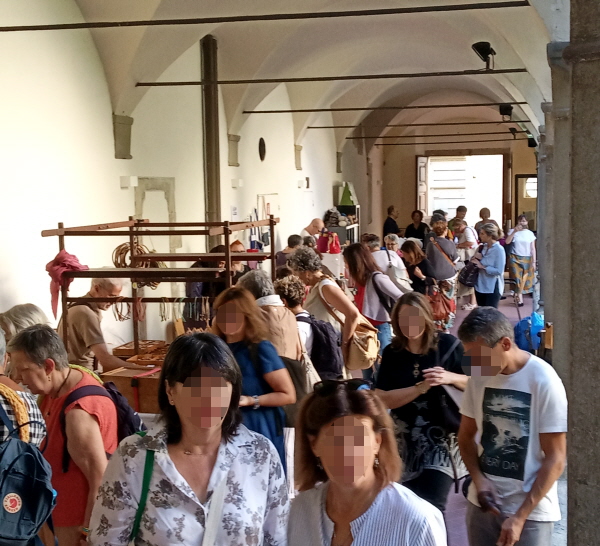 La conferenza si è svolta nel bellissimo Educatorio del Fuligno, nel cuore di Firenze. Una stupenda struttura antica a due passi dalla stazione di Santa Maria Novella e dal Mercato Centrale. Fuori dalla sala, nel cortile circondato da un portico, si è tenuto contemporaneamente un mercatino con la crema degli artigiani italiani. L’Officina del colore naturale, Alpacone, La cave à laine, Lana al Pascolo, Penelope Filati, Opistudio, Francesco Mangia con i suoi bottoni in legno, le borse in materiale riciclato di By Holly, a questi si sono affiancati le filature Biches et Buches e Borgo de’ Pazzi, e il negozio parigino Les Tricoteurs Volants, che potete contattare se desiderate acquistare qualsivoglia libro di Elizabeth Zimmermann o Meg Swansen.