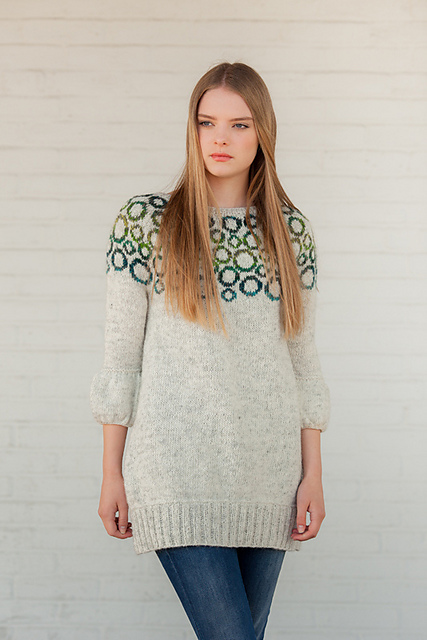 Continuiamo con Hringsól kjóll di Bergrós Kjartansdóttir. Eh, lo so, odiatemi, non riuscirete nemmeno a pronunciarli, né il nome del maglione né quello della designer. Come so che è femmina? Perché il cognome (o meglio, il patronimico) finisce con dóttir (figlia di) e non con son (figlio di). Eh, sono cose che si apprende solo facendo la luna di miele in Islanda, non potete capire… Ma torniamo a bomba. Lo sprone lavorato “a bolle” lo rende sportivo ed originale; caratteristica enfatizzata anche dalla forma oversized del corpo. Mi piace un sacco e già vedo una serie di fantastici abbinamenti per un week-end informale!