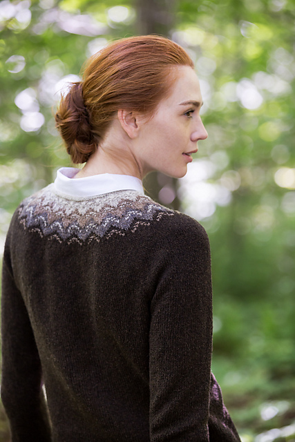Il primo è Flight di Sarah Pope. Non è particolarmente colorato e quindi già mi piace solo per questo, anche se nero sarebbe stato meglio, diciamolo! Diciamo anche che il marrone non è un colore che amo particolarmente, ma tant’è! Il motivo ton sur ton che passa dalla sfumatura più chiara a quella più scura è una delizia. Ricordiamo, vero, il consiglio di indossare una camicia bianca vicino al viso (che ci fa risparmiare un sacco di soldi in illuminatori dell’incarnato)? Ecco, questo maglione è la soluzione: non servirà nemmeno indossare la camicia perché ci pensa già da solo.