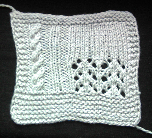 Alla lavorazione, Worsted Cotton è docile ai ferri, non si divide e scorre bene, anche se consiglierei di usare ferri metallici e non in legno o bambù. Il lavaggio, effettuato a mano e con acqua fredda ma con detergente aggressivo e senza troppe delicatezze, ha fatto leggermente allungare il campione, che in seguito però è tornato in forma senza problemi. Tassativa l’asciugatura in piano. Se desiderate eseguire un capospalla con questo filato, dato il peso di questo cotone, consiglio comunque di eseguire anche la prova di allungamento appendendo il campione asciutto per due o tre giorni in modo da valutarne l’allungamento. Nonostante il cotone non sia trattato, non ho notato alcun restringimento, che comunque è possibile con il lavaggio a caldo o macchina. Lavorato con un ferro 5, il campione ha reso una tensione di 14 maglie su 10 cm, nettamente inferiore alla tensione consigliata di 16-20 m per 10 cm, ma va detto che il mio campione è notevolmente morbido e sono certa che il filato possa essere lavorato più fitto, anche se non arriverei a 20 m per 10 cm. Ovviamente, trattandosi di cotone, questo Worsted Cotton non rende al meglio sui punti elastici come le coste, che restano piatte, ma la treccia a quattro maglie ha una bella definizione ed è gonfia e morbida, quindi il filato mi pare adatto anche per le lavorazioni Aran. Ottima anche la definizione nel punto traforato. Il maggiore punto negativo del filato è che tende notevolmente a fare pallini: la superficie poco compatta del cotone avvolto in gomitolo ha fatto un accenno di pallini anche solo per l’essere stato portato in giro in borsa!
